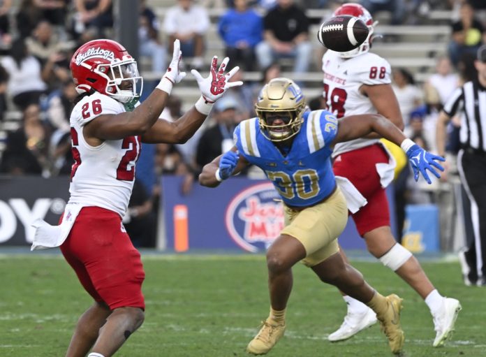 Jalen Moss fumbled a punt return early in the second quarter and UCLA recovered at the Bulldogs’ 12-yard line, but the Bruins had to settle for another field goal, a 40-yarder by Bhaghani that extended the lead to 6-0 with 12:51 left in the half.