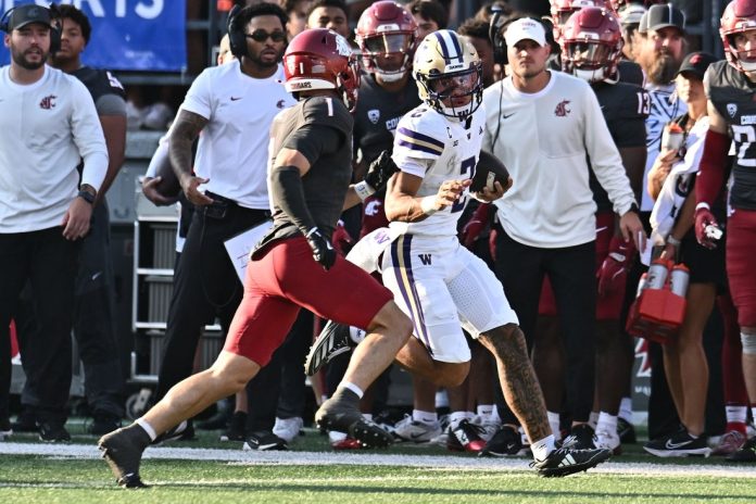 Demond Williams Jr. threw four touchdown passes and rushed for another and Washington scored 28 unanswered points in the fourth quarter to defeat Washington State 59-24 on Saturday in the Apple Cup in Pullman, Wash.