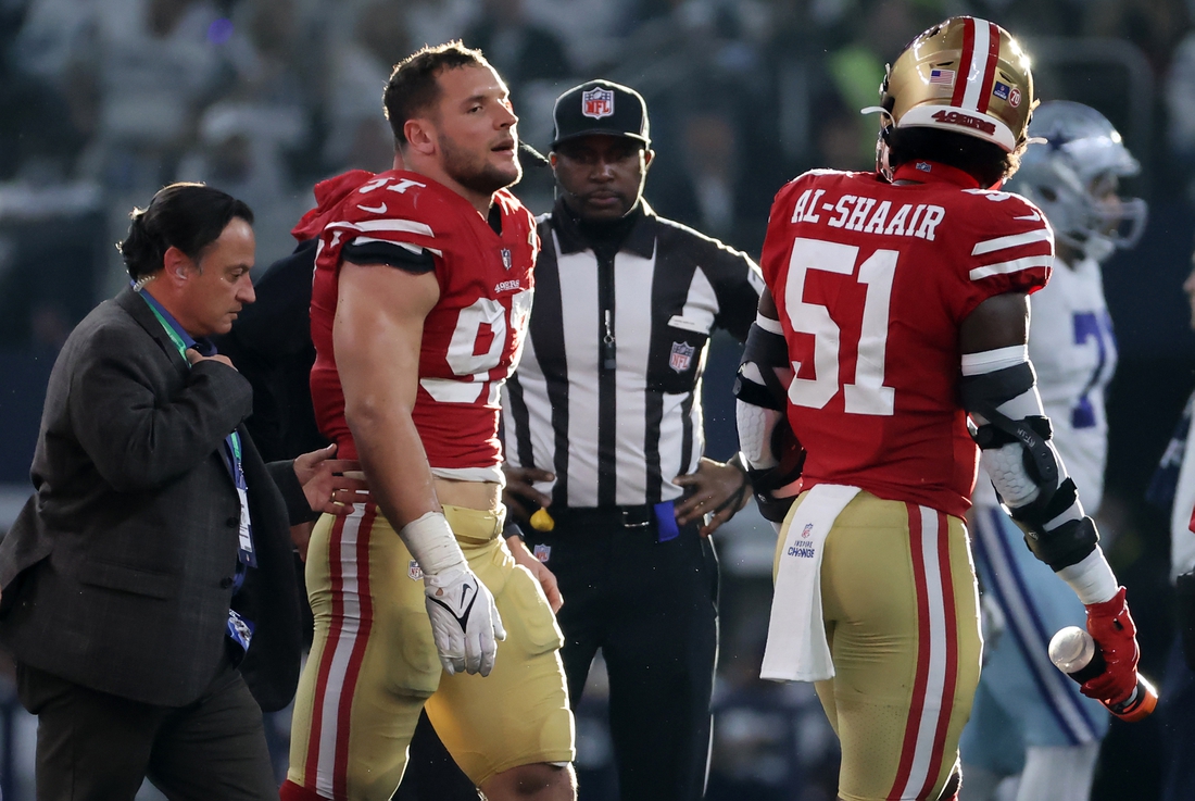 Bosa missed the second half of San Francisco’s 23-17 wild-card win over the Dallas Cowboys. Garoppolo played the whole game despite spraining his throwing shoulder in the second quarter.