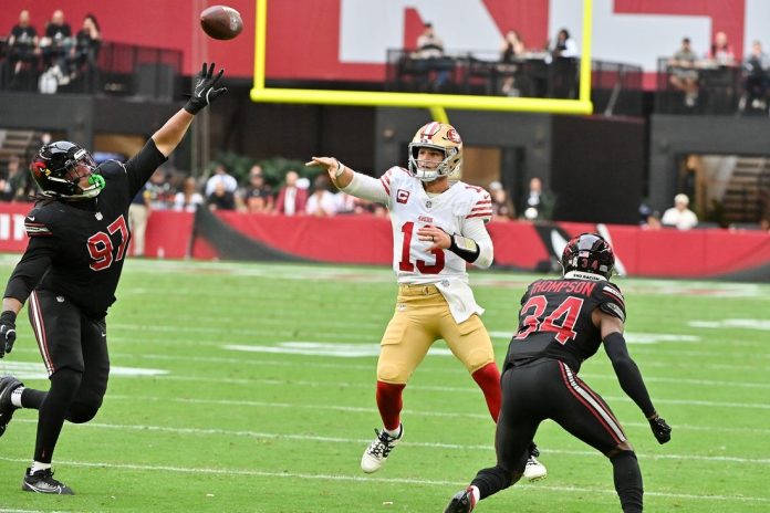 Brock Purdy passed for 200 yards and three touchdowns in his first game since Sept. 28, Christian McCaffrey scored three touchdowns and the San Francisco 49ers beat the error-prone Arizona Cardinals 41-22 on Sunday in Glendale, Ariz.