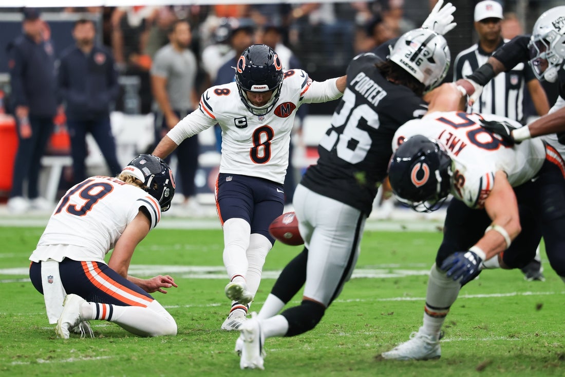 Santos keyed the Bears’ victory over Las Vegas on Sept. 28, hitting all four attempts in the 25-24 triumph. But he injured his thigh in the third quarter of that game and Tory Taylor handled the kickoff duties. The injury did not heal sufficiently during the Bears’ bye week.