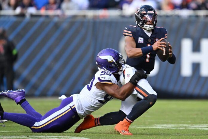 Backup quarterback Tyson Bagent took over for Fields and fumbled on his first NFL drive, with the Vikings returning it for a touchdown. Bagent later scored on a 1-yard sneak, but the undrafted rookie out of Division II Shepherd University in Shepherdstown, W.Va., was intercepted to end Chicago’s final drive.