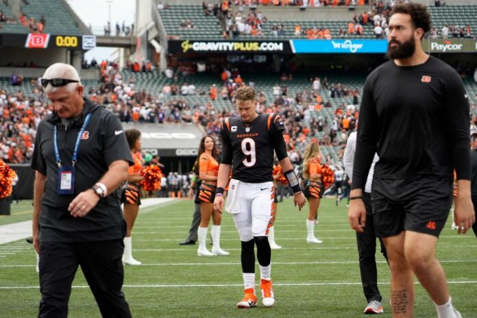 Cincinnati Bengals star quarterback Joe Burrow aggravated his right calf on Sunday and said after the game that he was uncertain of the severity of the injury beyond the fact that it is “pretty sore right now.”