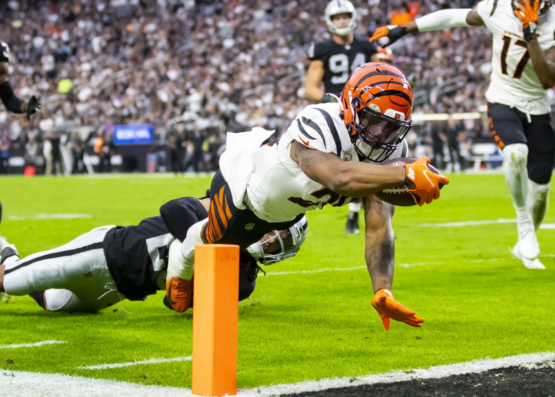 Joe Mixon rushed for 123 yards and two touchdowns on 30 carries and Evan McPherson kicked three field goals of more than 50 yards to lift the Cincinnati Bengals to a 32-13 victory over the host Las Vegas Raiders on Sunday.
