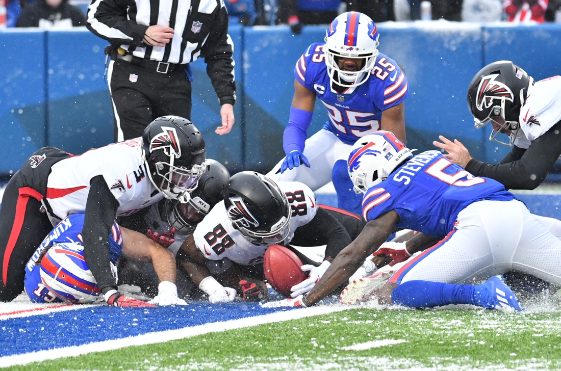 Buffalo was on the verge of building on its lead in the first half when Duron Harmon picked off a batted pass in the end zone. On the next snap, Ryan and Kyle Pitts hooked up for a 61-yard completion that led to a a 1-yard touchdown carry by Mike Davis.