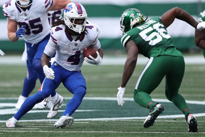 On their first series, the Bills used Allen’s feet (40-yard run), a fourth-down conversion and a roughing the passer penalty to score the first points. Cook capped the 12-play, 81-yard drive with a 1-yard run at 7:29 for his sixth straight outing with a rushing TD.