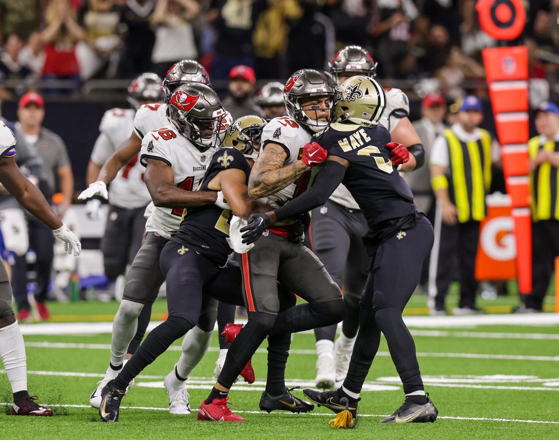 After Lattimore began shouting at Tampa Bay quarterback Tom Brady, Bucs running back Leonard Fournette pushed Lattimore away and Lattimore pushed back. Evans joined the fray with a head of steam — shoving and leveling Lattimore — and engaged with other Saints before the dust settled.