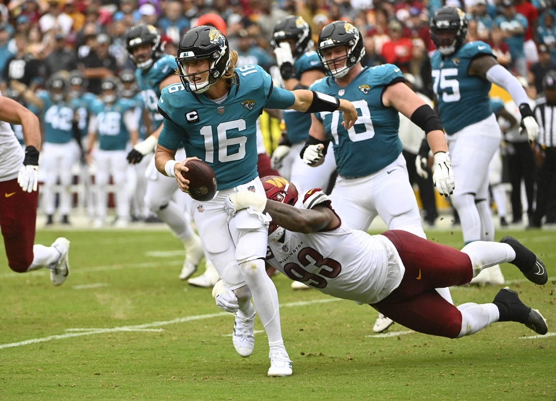 Jacksonville drove inside the Washington 10 twice in the final six minutes of the first half but came up empty. On fourth-and-goal from the 3, running back Travis Etienne was open in the flat but dropped a potential touchdown pass.