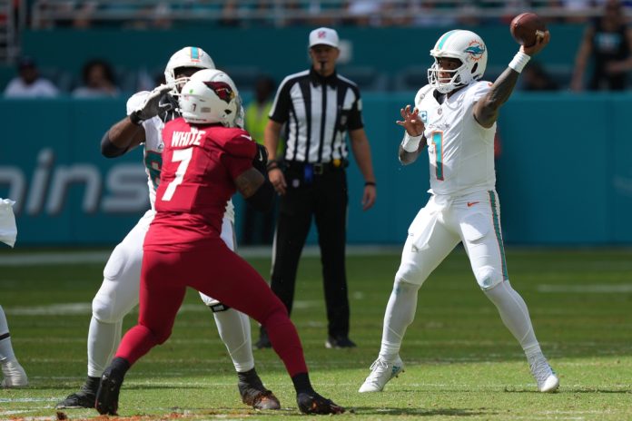 When the Dolphins next had the ball, Aaron Brewer’s errant shotgun snap was batted through the end zone by Tagovailoa with the safety pulling Arizona within 20-12 with 6:15 left.