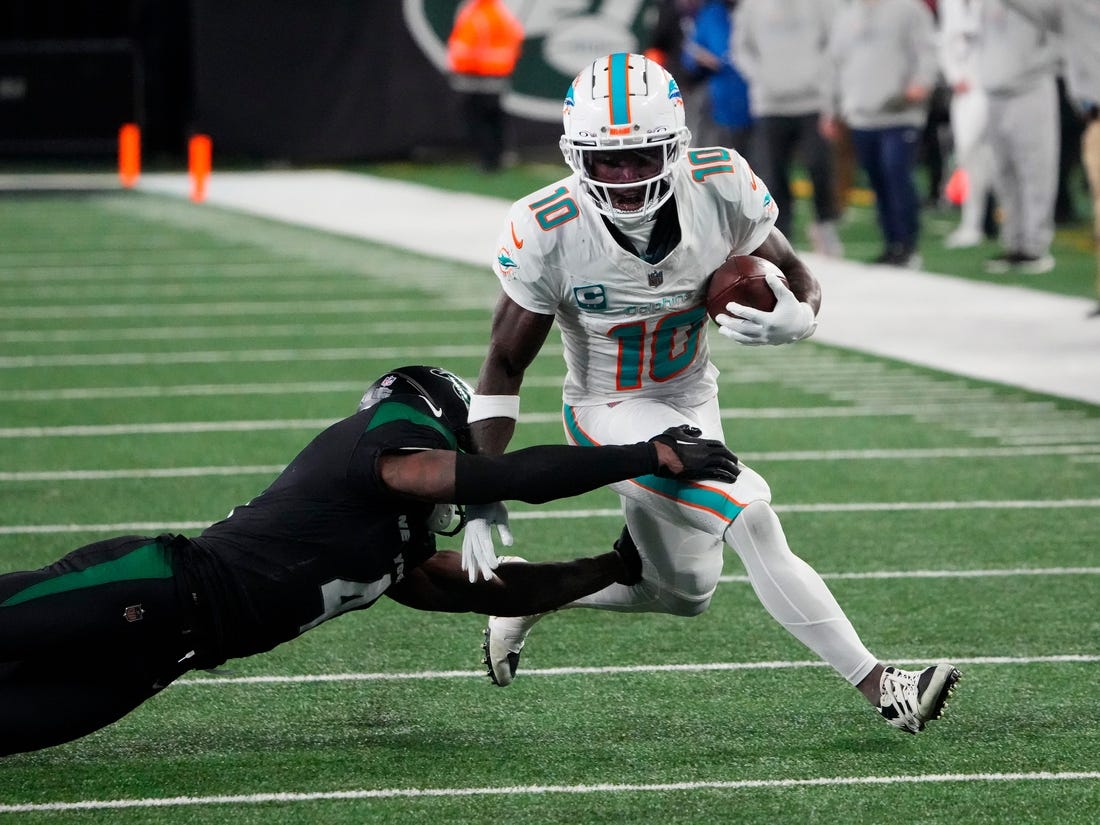 Hill had nine receptions for 102 yards and a touchdown in Miami’s 34-13 win at the Jets last month. Waddle caught eight passes for 114 yards in that game.