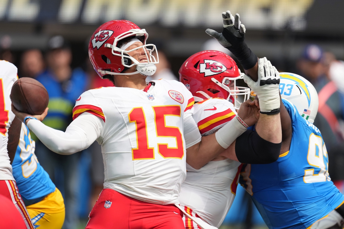 Kristian Fulton then intercepted Mahomes on the Chiefs’ next snap. While trying to tackle Fulton, Mahomes dove helmet first into Rice’s knee. Rice was carted off the field and Los Angeles soon made it 10-0 on Cameron Dicker’s 50-yard field goal.