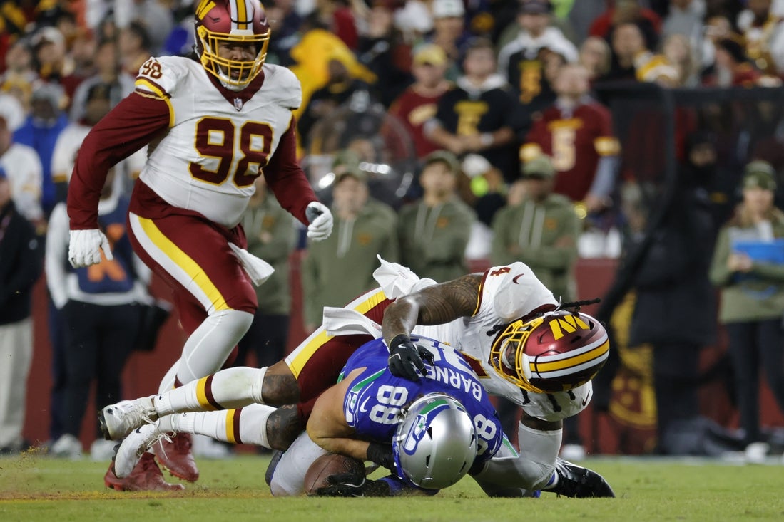 The tackle in question happened midway through the first quarter of Washington’s 38-14 defeat to the Seattle Seahawks, when Luvu pulled down Jaxon Smith-Njigba in the open field as three other defenders converged.