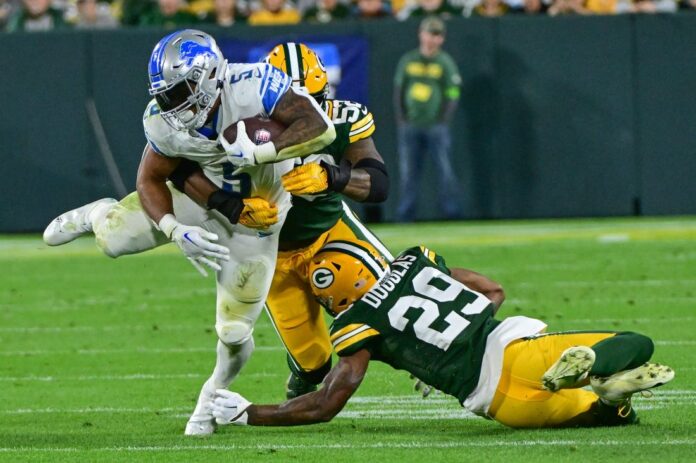 Anders Carlson opened the scoring with a 34-yard field goal for the Packers before the Lions scored the final 27 points of the first half.