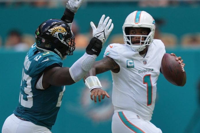 Jacksonville running back Travis Etienne opened the door for the Dolphins, fumbling at the Miami 3 with 2:19 left in the third quarter. Kader Kohou recovered the loose ball in the back of the end zone for a touchback.