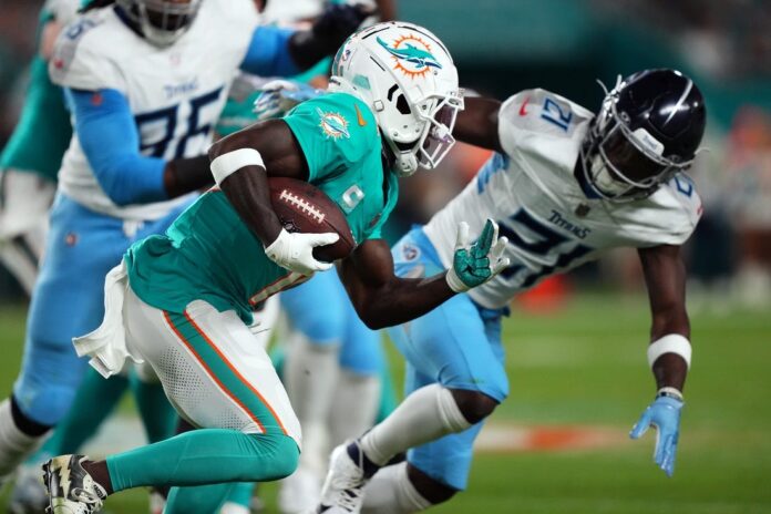 Hill, who is having a receiving season for the ages, was injured late in the first quarter while being tackled. Tennessee’s Sean Murphy-Bunting brought down Hill, with the latter’s lower left leg getting stuck underneath the left side of the cornerback’s body.