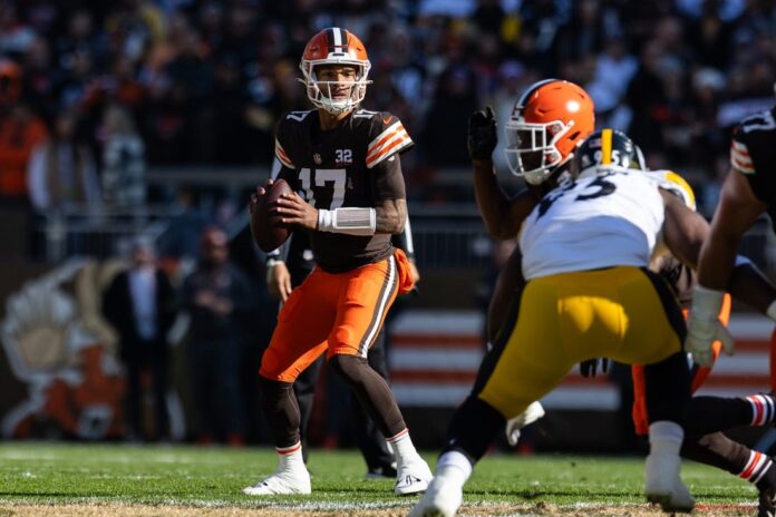 Later in the third quarter, Thompson-Robinson’s pass squirted out of the waiting hands of Amari Cooper and Chandon Sullivan grabbed the interception. But the Steelers proceeded to go three-and-out.