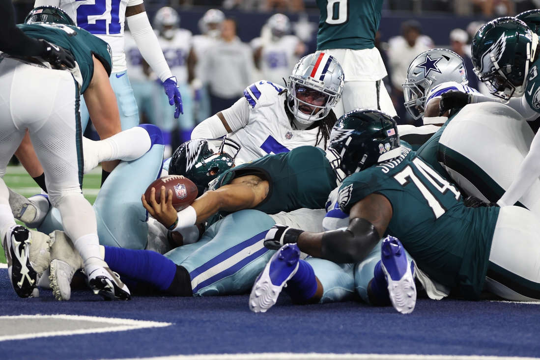 Hurts turned it over twice in the second quarter, an interception by Trevon Diggs in the end zone and a fumble that was recovered at the Eagles’ 6-yard line, but Dallas only converted those miscues into three points.
