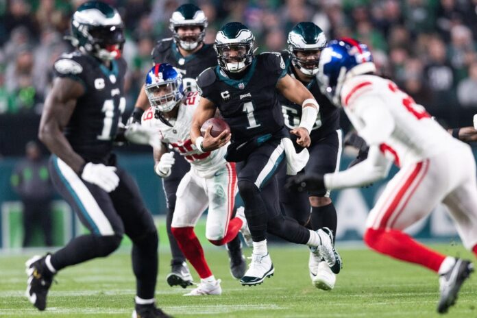 The Giants went three-and-out on the game’s first possession, and Britain Covey’s 54-yard punt return set up the Eagles on the New York 13-yard line. Two plays later, Hurts ran for a 1-yard touchdown.