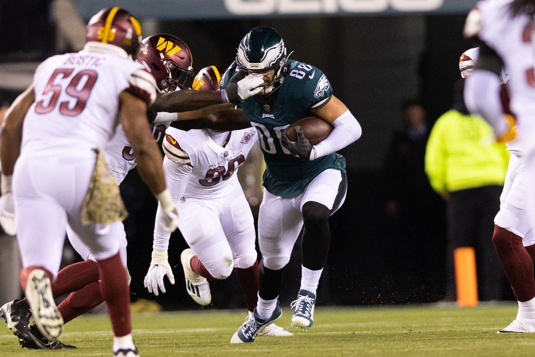 Goedert had three catches for 23 yards and a touchdown in the previously unbeaten Eagles’ 32-21 setback against the visiting Commanders.
