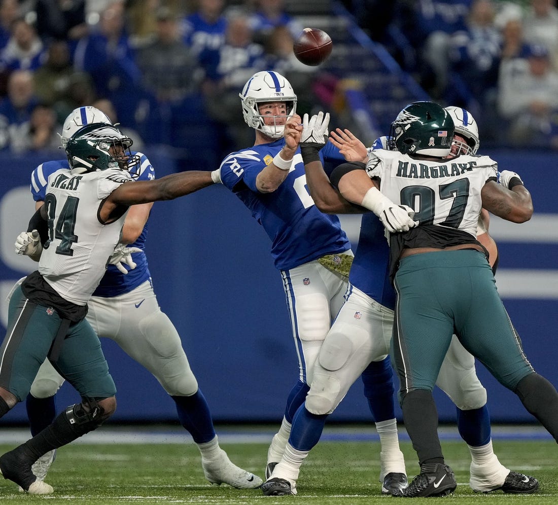 Each team fumbled on its next possession. Three plays after Taylor coughed one up near midfield, Philadelphia’s A.J. Brown had the ball punched out by Zaire Franklin and recovered for the Colts by Eric Johnson at the Indy 34-yard line.