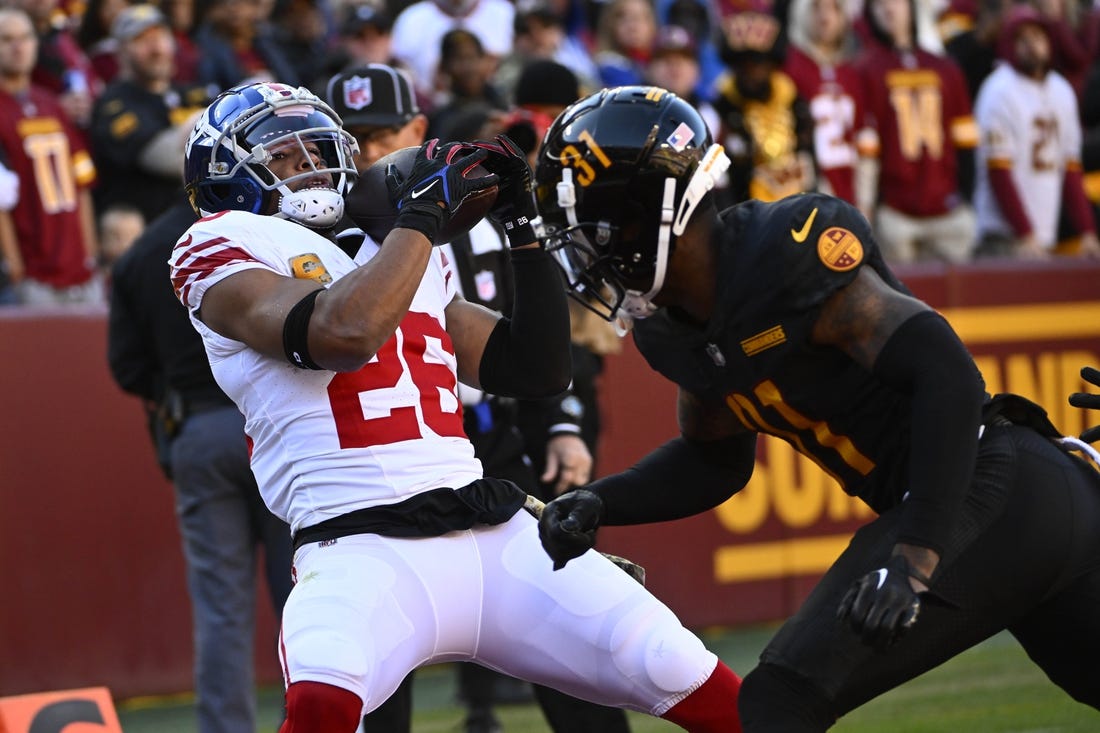 Saquon Barkley had two of the touchdown receptions and rushed 14 times for 83 yards as the Giants (3-8) won for just the second time in their past nine games, with both of the victories coming over the Commanders (4-7).
