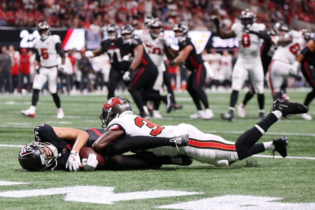London landed hard on his right shoulder in the end zone attempting to secure a touchdown pass from Michael Penix Jr. The Falcons initially believed it was ruled a touchdown before it was ruled incomplete, with the call standing after an instant-replay review.