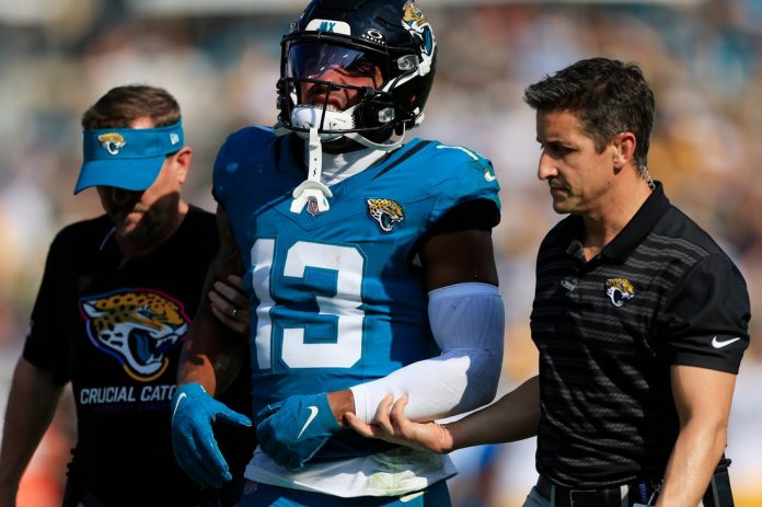 Christian Kirk is done for the season with a broken collarbone and rookie Brian Thomas Jr. will undergo an MRI on his ribs, multiple outlets reported. Gabe Davis left in the second quarter with a shoulder injury and did not return.