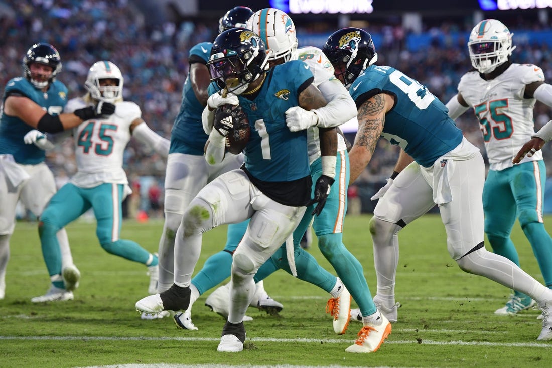Three rushers found their way to the end zone as the host Jacksonville Jaguars beat the Miami Dolphins 31-18 in a preseason game on Saturday night.