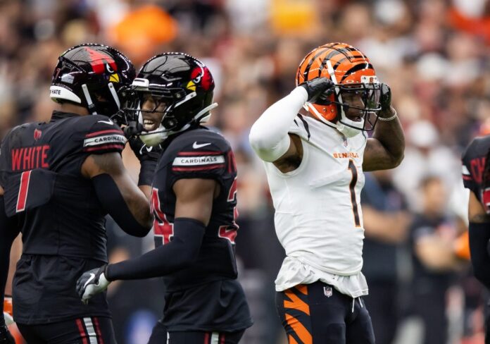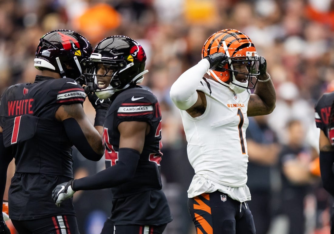 Joe Burrow threw three touchdown passes to Ja’Marr Chase to lead the Cincinnati Bengals past the Arizona Cardinals, 34-20, on Sunday in Glendale. Ariz.