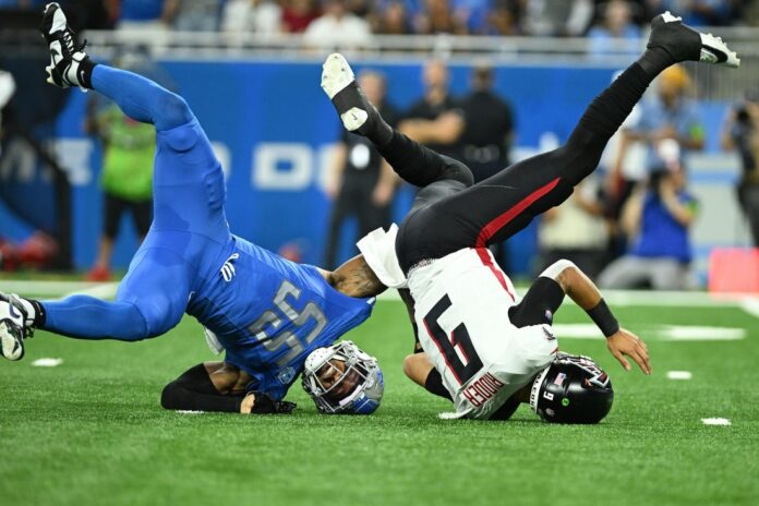 The Lions’ defense had seven sacks, with Aidan Hutchinson credited with two, and limited the Falcons’ rushing attack to 44 total yards.