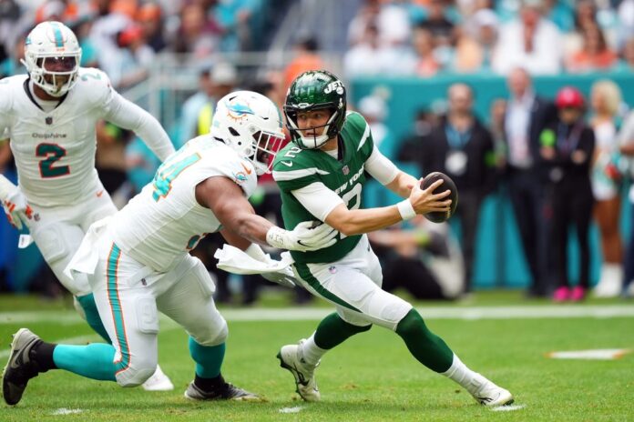 New York Jets quarterback Zach Wilson exited Sunday’s game against the Miami Dolphins late in the second quarter with a head injury and was ruled out early in the second half.
