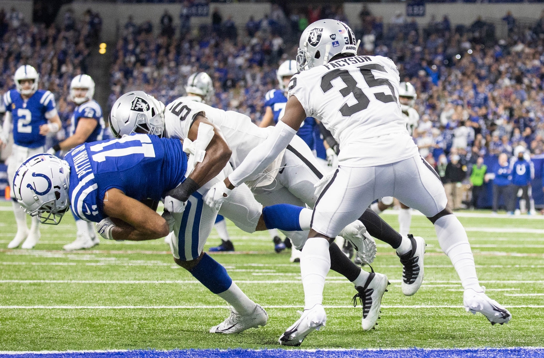 The big play on the winning drive was Derek Carr’s 24-yard completion to Hunter Renfrow that moved the ball to the Indianapolis 24-yard line. Three Josh Jacobs runs ran the clock down to two seconds, setting the stage for Carlson.