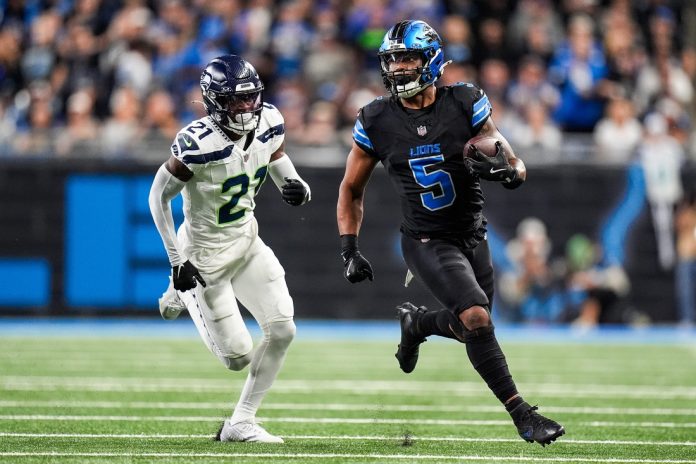 Detroit’s next touchdown was set up by Carlton Davis’ 49-yard return of a Metcalf fumble. Gibbs scored three plays later on a 3-yard run.