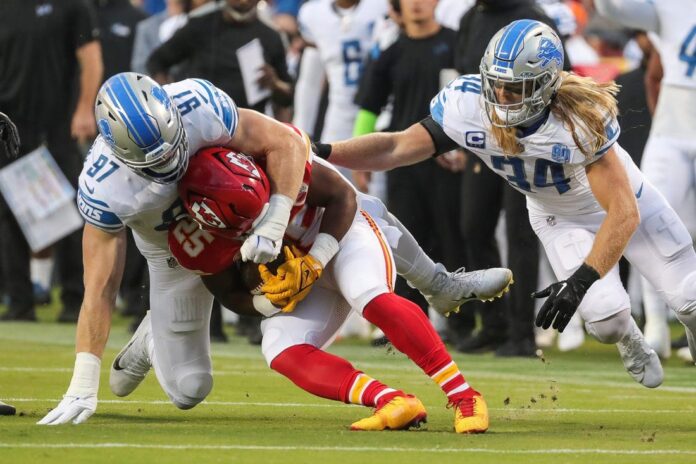 The Lions’ defense came up big in the second half. Rookie Brian Branch’s 50-yard interception return of a Patrick Mahomes pass that caromed off open receiver Kadarius Toney tied the game at 14 just over four minutes into the third quarter. Detroit later stopped the Chiefs on their final two possessions after taking the lead.