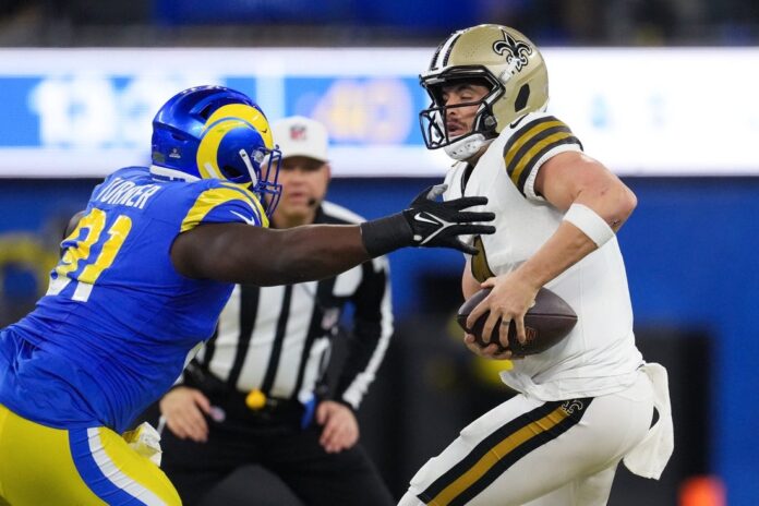 Carr connected with A.T. Perry for a 35-yard touchdown and a two-point conversion to Olave to trim the lead to 30-22 with 3:53 left, but the Rams recovered the onside kick and ran out the clock.