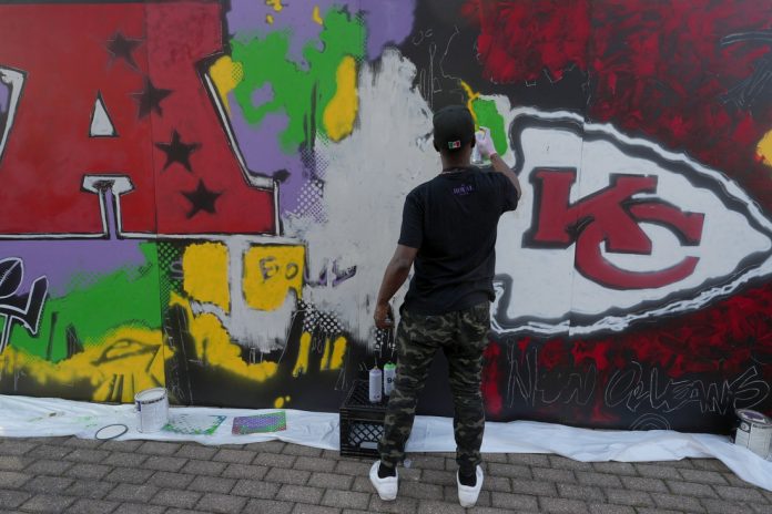 The commissioned art, designed by local artist Tahj “Queen Tahj” Williams, incorporates bright red, green and yellow colors, and that theme is on display on the streets surrounding the Caesars Superdome, the site of this year’s game.