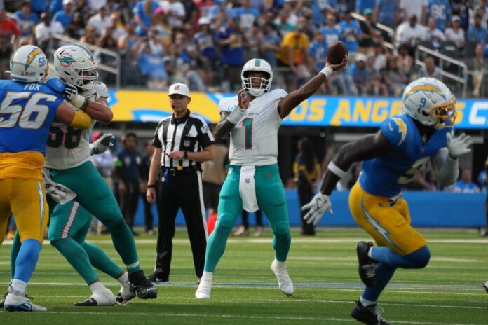 Tyreek Hill’s 4-yard touchdown catch from Tua Tagovailoa with 1:45 to play served as the game-winner as the Miami Dolphins survived a back-and-forth fourth quarter and prevailed 36-34 over the Los Angeles Chargers on Sunday in Inglewood, Calif.