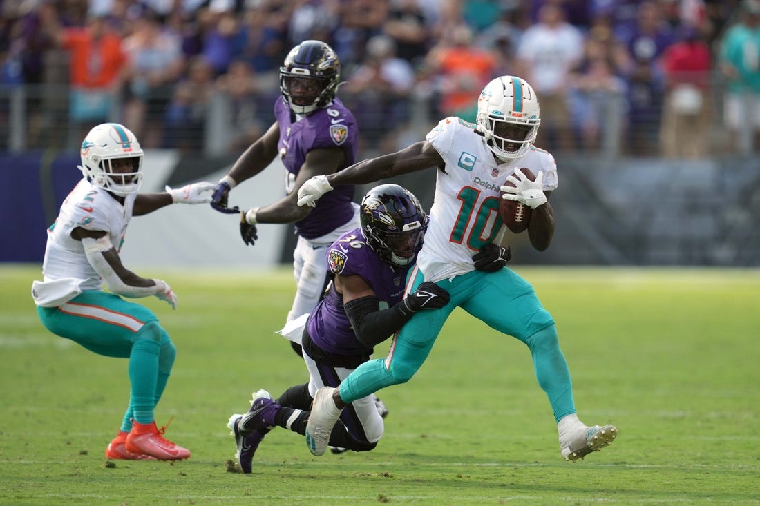 Tagovailoa completed 36 of 50 passes for 469 yards and six TD passes, tied for the second-most in a single game in NFL history. Waddle and Tyreek Hill had 11 receptions apiece in the game, with Hill totaling 190 yards receiving and Waddle gaining 171 yards. No wide receiver tandem has had 170-plus yards and two touchdowns each in the same game since at least 1950, per the NFL.