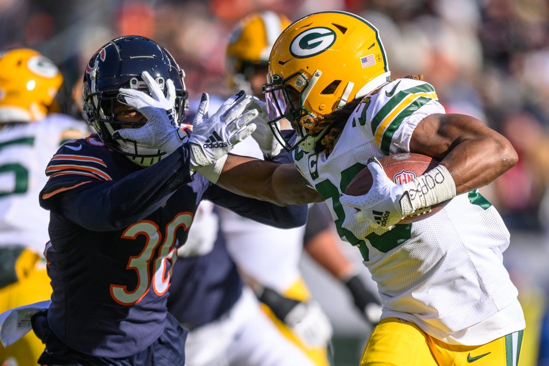Green Bay Packers running back Aaron Jones left Sunday’s game in Chicago with a shin injury.