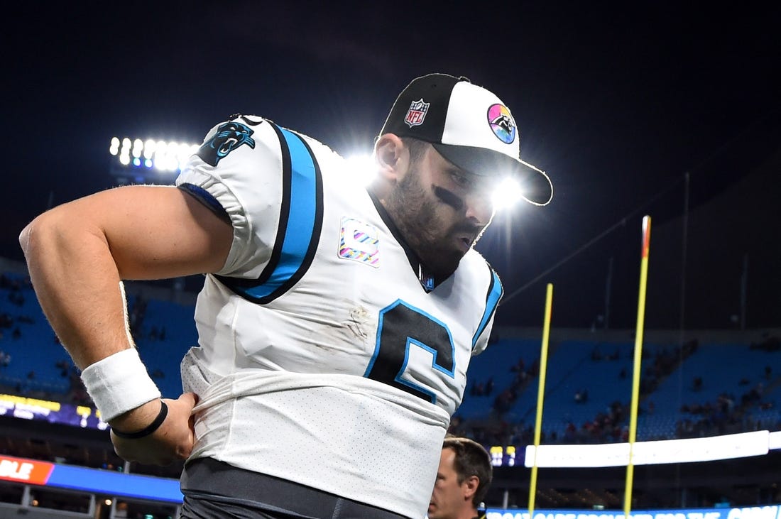 Baker Mayfield was on the practice field with the Carolina Panthers on Friday, but only to attempt to run and throw a few passes on the side.