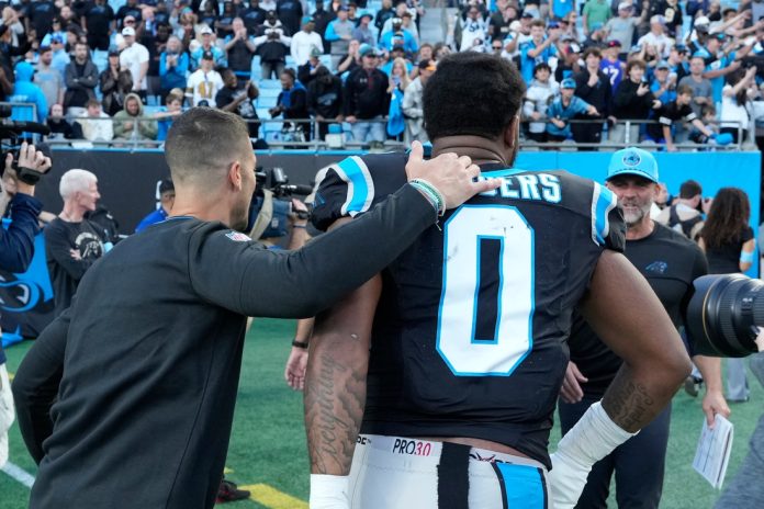 Carolina coach Dave Canales said Sanders was in the building the day after being taken off the field on a stretcher to the hospital for tests. According to Canales, the Panthers and medical personnel are still working through a full evaluation of the injury.
