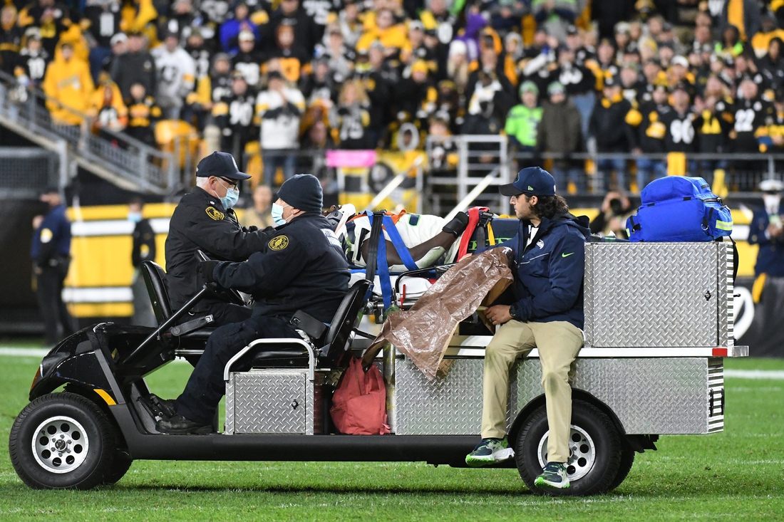 Seattle defensive end Darrell Taylor was taken off the field on a stretcher Sunday night in the fourth quarter of the Seahawks’ 23-20 overtime loss to the Pittsburgh Steelers.