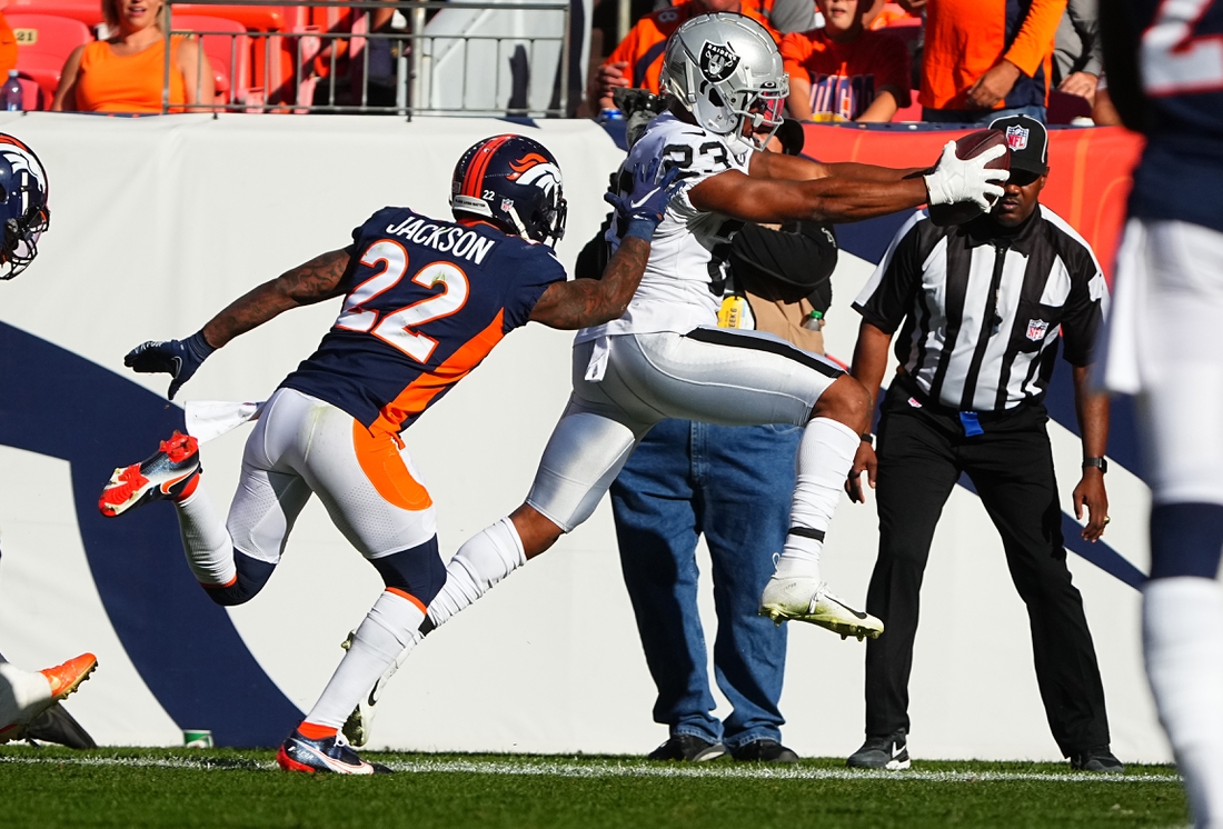 Denver managed just one yard on its first possession of the second half and Las Vegas answered with another score. The Raiders got the ball on their 44 and needed just four plays to score, with Drake running the final 18 yards to make it 24-7.