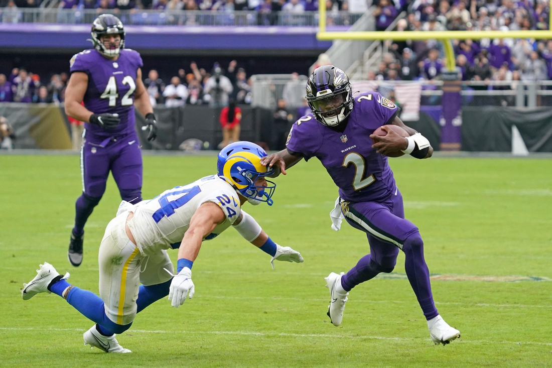 The Ravens were looking to add to a 10-0 lead late in the first half when Huntley was intercepted by Jordan Fuller at the Rams’ 37-yard line. His 34-yard return set up Stafford’s 18-yard TD pass to Kupp, pulling the Rams within 10-7 with 55 seconds to go in the half.