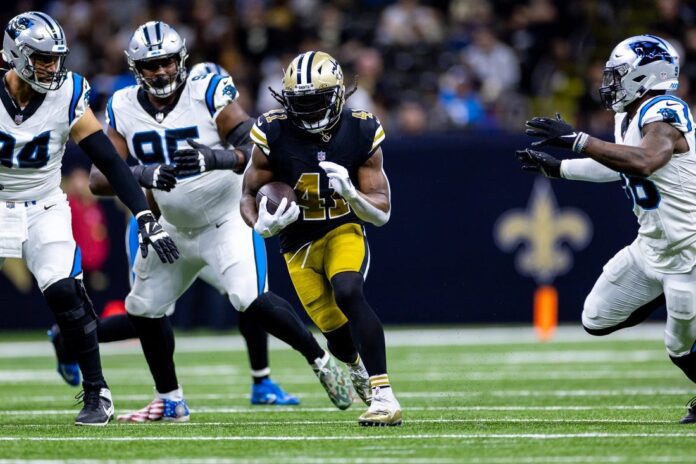 After a scoreless first quarter, the Saints’ Alvin Kamara ran 9 yards for a touchdown on the first play of the second quarter.