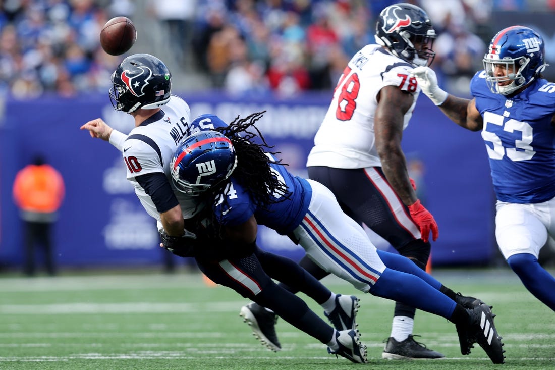 In the fourth quarter, Mills had his scoring pass to Brandin Cooks wiped away by a holding call on rookie guard Kenyon Green. On the next snap, Giants safety Dane Belton picked off Mills in the end zone.