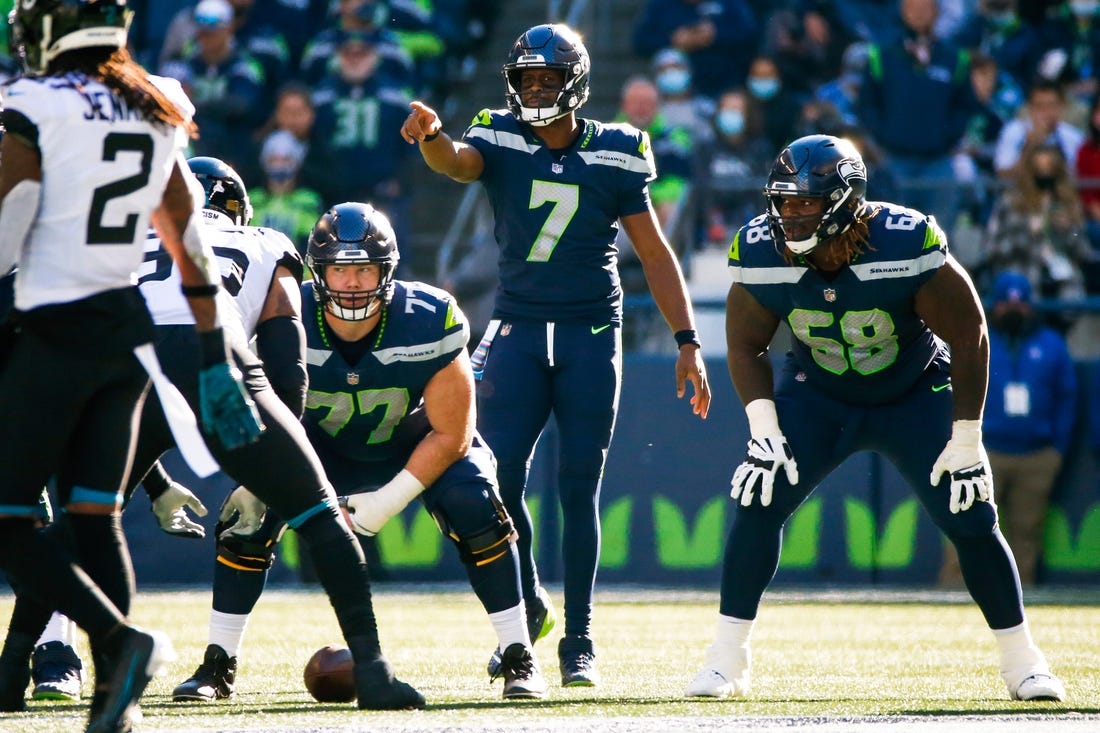 With 14:05 left in the first half, Seattle’s DeeJay Dallas ran for a 2-yard gain on the play. Angelo Blackson made the tackle but rolled on Lewis’ ankle in the process.