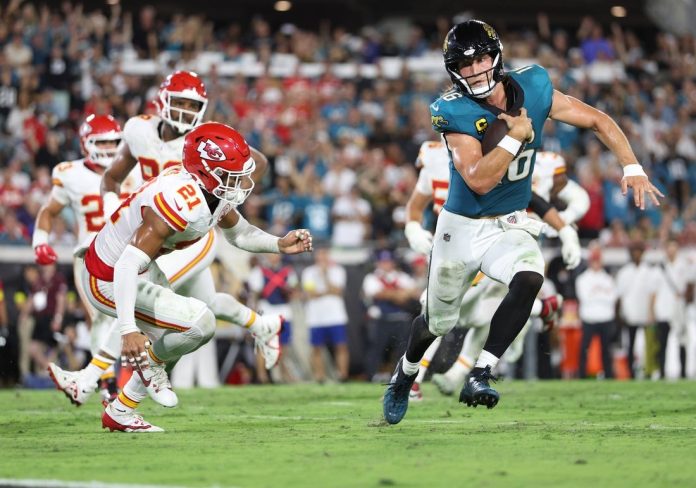 Brian Thomas Jr. led Jacksonville with four receptions for 80 yards, and Travis Hunter had three catches for 64 yards.