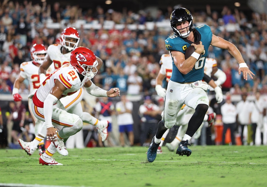 Trevor Lawrence ran for a 1-yard touchdown with 23 seconds left to give Jacksonville a 31-28 win over the visiting Kansas City Chiefs on Monday night, as the Jaguars improved to 4-1 for the first time since 2007.