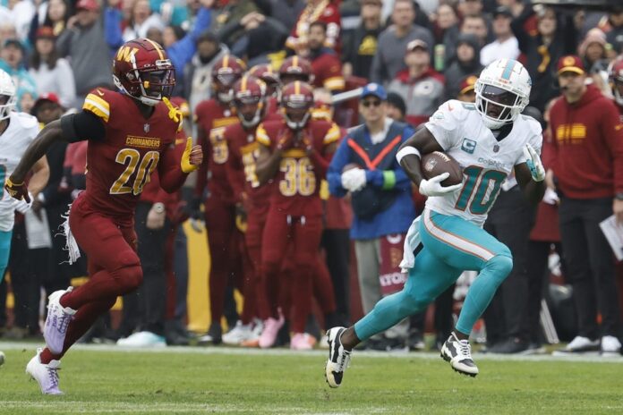 Hill started the scoring with a 78-yard touchdown reception on the Dolphins’ opening drive. He got behind the secondary, caught a pass from Tagovailoa near midfield and outraced a pair of Commanders defenders to the end zone.